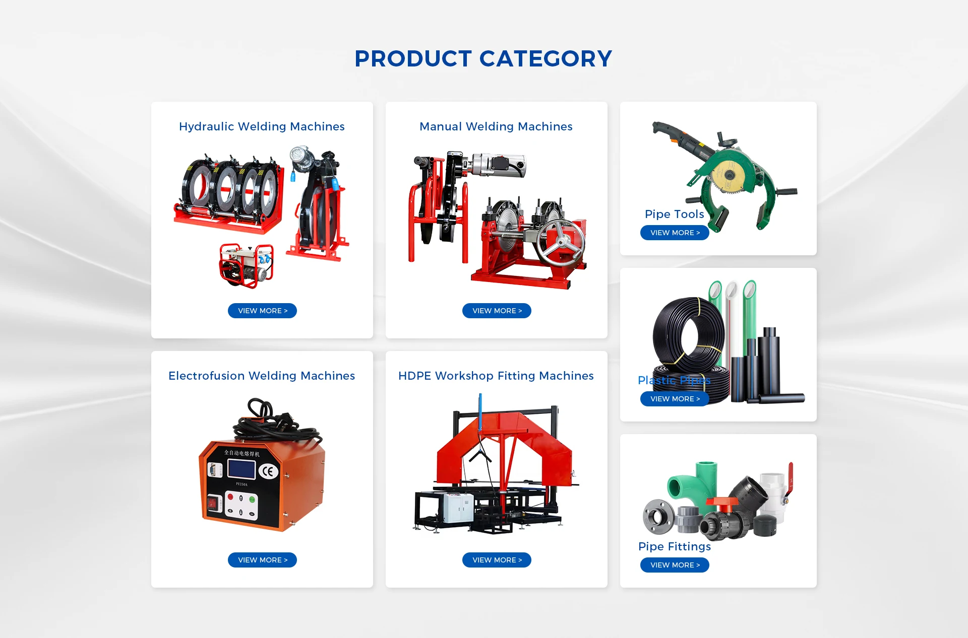 Main categories: Hydraulic Welding Machines, Electrofusion Welding Machines, Manual Welding Machines, Multi-angle Workshop Fitting Machines, Pipe Tools